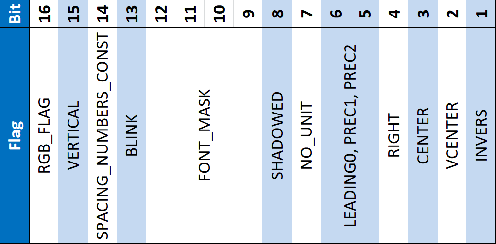 An argument with drawing flags can be given to the various functions that draw on the LCD screen. The lower half of the flags (bits 1-16) are the flag attributes shown below, and the upper half of the flags (bits 17-32) are a color value.
